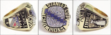 Mark Messier "promised" this ring to the fans of New York. Massive 10K coded sample from the year The Curse was lifted. Blue enamel "Rangers" runs diagonally across the CZ-encrusted face with raised "Stanley Cup Champions." One shank features the raised images of the Cup flanked by the Wales and President's trophies in front of MSG with "1994" and "112 Points." The opposite side has the enameled crest of the Rangers over a backdrop of the New York Skyline with "Sample," "1" and "Heave Ho." In pristine condition.