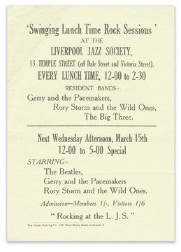 After their Cavern lunchtime session (their fifth appearance overall), the group spent the rest of the afternoon sharing the stage with another future Brian Epstein managed band, Gerry & The Pacemakers. Rory Storm without Ringo Starr and the remaining Hurricanes, rounded out the bill. Acquired from Hurricane's guitarist, Johhny "Guitar" Byrne. Nicely aged with creasing and a small tear along left edge. 5 ?"x7"