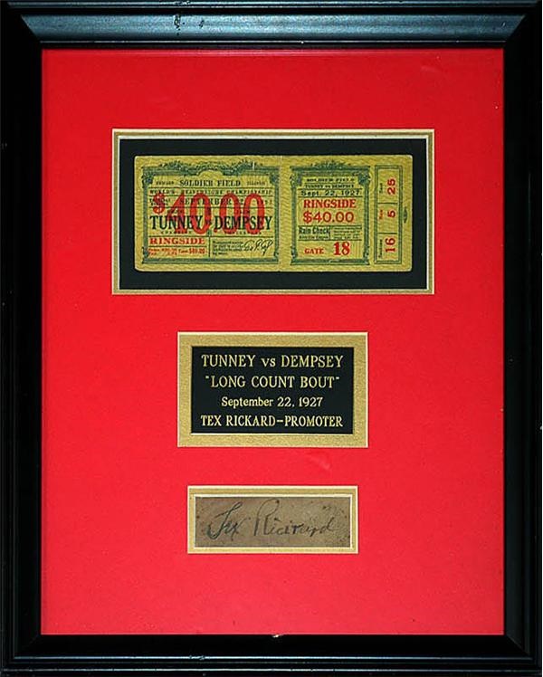 Full ticket for the September 22, 1927 event. There is a heavy vertical crease that may break the paper, but it is hard to tell for sure under glass. Several other small, light creases. Rickard signature is on a piece of leather-maybe from a boxing glove and is 7-8 on scale of 1-10