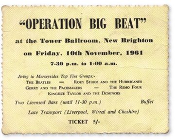 "Jiving to Merseysides Top Five Groups" was promised to those in attendance at the first of five "Operation Big Beat" extravaganzas staged by promoter and longtime Beatles supporter, Sam Leach. More than 3000 fans jammed the Tower Ballroom to watch each group perform twice at the nearly six hour event. This was the group's first appearance after meeting future manager, Brian Epstein, who had come to see them for the first time at the Cavern a day earlier, arguably the most important day in both of their lives. The ticket's scalloped edges were a trademark characteristic of Seaview Press, the Liverpool printer responsible for producing tickets and promotional materials for many venues during the 1960's. Creased with a name, address, and the word "Dingle" (a reference to a working class Liverpool neighborhood), written in ink on reverse. 4 ?"x3 ?".