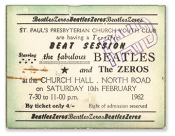 The group's first appearance at this Presbyterian Church Youth Club must have been a rousing success since they were invited back a month later. Scalloped, gold leaf border! Two rust stains, a tear along the top edge, and writing on the reverse "Mr. Brian Epstein.. Nems….Ray 7895…Feb 10 Beatles, Mar 3. Country 4, April11 (Wed) Zero's…May 12. Gerry". 4 ?"x3 ?".