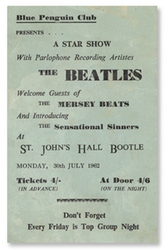 Heralding "A Star Show With Parlophone Recording Artistes..The Beatles", this was a welcome return to the Bootle section of Liverpool. Some creasing and discoloration. 5 ?"x3 ?".