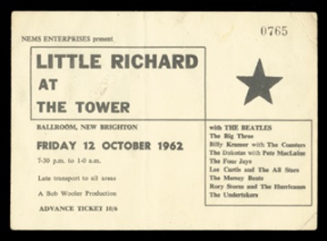 This oversized ticket for the historic "Little Richard At The Tower" gig exhibits moderate creasing with minimal visual distraction. A name is written on the reverse in black ballpoint. 5 ?"x4".