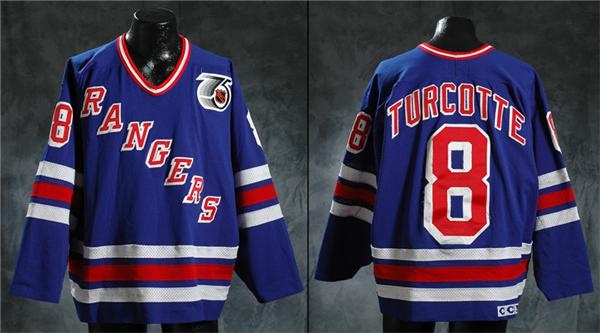 Center Darren Turcotte was invaluable to his New York Rangers, as this red, white and blue jersey’s 1991-92 season of play can attest. Worn during a stellar second of four consecutive years of 20+ goals for the forward, as well as a Division Championship for the Blueshirts. This jersey sports a NHL 75th anniversary patch on its left breast, tackle-twill “Rangers” diagonally across its front, as well as twilled, individually-lettered “Turcotte” and his “8” on verso, stringy from use. Cosby manufacturer’s tag, size 52 flag, and CCM care tag in collar. A couple of subtle burns, and board marks scar this keeper.