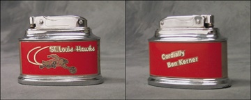 Extraordinary cigarette lighter presented by the owner of the team to players and dignitaries. In red enamel paint, the front features the Hawks playing basketball with "St. Louis Hawks" overhead. On the verso "Cordially Ben Kerner." 2.5x3", NRMT and works perfectly. Although not marked as such, it is believed that these were given out during the season following their 1958 World Championship. That is likely, based on the age of the lighter itself and the generosity of those good times.