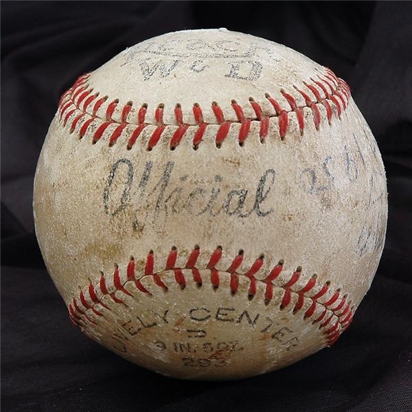 Evenly toned Reach W&D baseball has been inscribed in blue ballpoint pen by baseball's most revered and referenced pitcher, "Cy Young-Sept 27, 1950". Framed nicely by the red stitching along the side panel, it grades a "6.5" out of possible "10", the ball VG-EX.