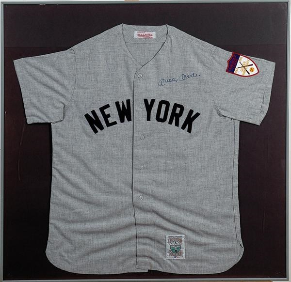 Framed replica of 1951 New York Yankee road flannel that Mickey Mantle wore during his rookie season is a fine Mitchell & Ness version, with shield patch on left shoulder that reads, “American League 1901-1951 Golden Anniversary,” and a Cooperstown tag on bottom left front. It was a changing of the guard in ’51, with retiring Joe DiMaggio handing off his center fielding position (and idol status) to the fledgling Mantle, who signs in 9/10 blue Sharpie on the left portion of the chest. Measures 39 ? x 38 ?”.