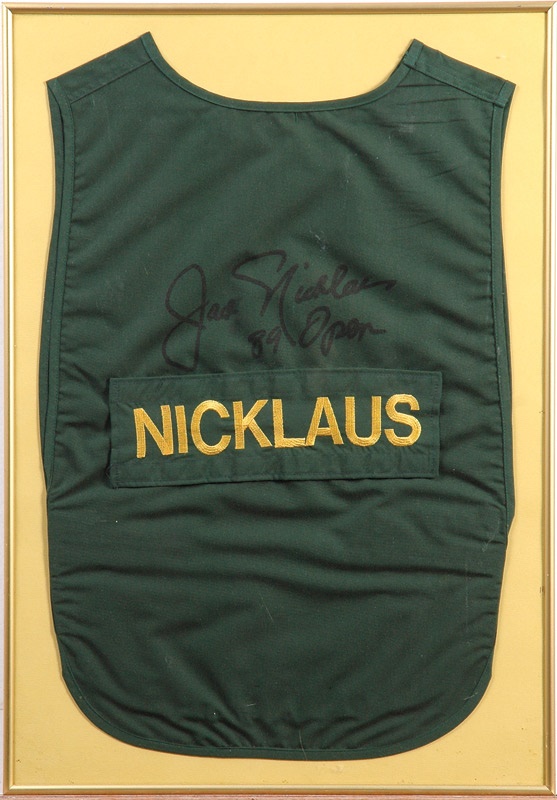Jack Nicklaus was a silver bear when he played in the 1989 U.S. Open, from which this, the actual green vest, was worn by the Golden Bear’s caddy for the entire Open. A pivotal year for the holder of most majors ever won (18), as he would become eligible early in the next year, as a 50-year-old, to play in the Champions Tour; a sort of a swan song season for this champ’s youthful endeavors, as this vest can certainly be seen as a symbol of. The caddy kept this vest and had Nicklaus sign it across the front in 9/10 black marker. The signature, as is its meaning, is huge - “Jack Nicklaus 89 Open.” Vest is all original with “Nicklaus” stitched in yellow on a plate that is affixed to the vest with velcro. Gold-framed to 20 ¼ x 27 ¼”.