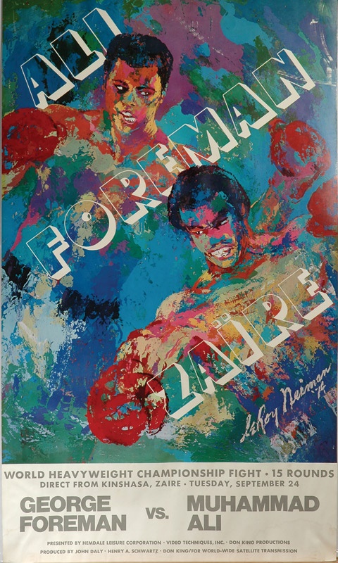Two exceptional posters advertising "The Rumble in the Jungle" Each poster contains the original date of the heavyweight title fight - Tuesday, September 24 - which was changed to the eventual date of October 30th after Foreman was injured while training. 1) Poster with graphics by Leroy Nieman is on heavy stock paper. Condition is VG-EX with some waves (from moisture) in the paper. Measures 22 ?” x 37 ?”. 2) Cardboard poster for a closed circuit telecast of the fight has photographic images of both boxers, and has been signed by Ali in 9/10 black felt-tip pen. Poster itself is VG-EX, and measures 14 x 22”.