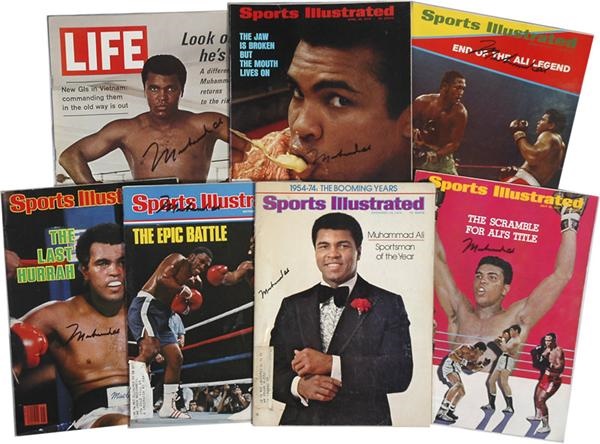 A thorough collection of signed publications spanning Ali’s tremendous career. Two copies of “Muhammad Ali - A Thirty Year Journey” have Ali’s signature (both an 8/10) as well as the author’s. Life Magazine from 1970 with Ali on the cover is signed in large black felt tip and rates a 10/10. The remaining six magazine are all Sports Illustrated with Ali’s mug on the cover from the following years: 1967, 1971, 1973, 1974, 1975 and 1980. They are all signed in black felt tip pen and rate 9/10. All of the magazines are in EX condition. All the signatures were obtained in person.