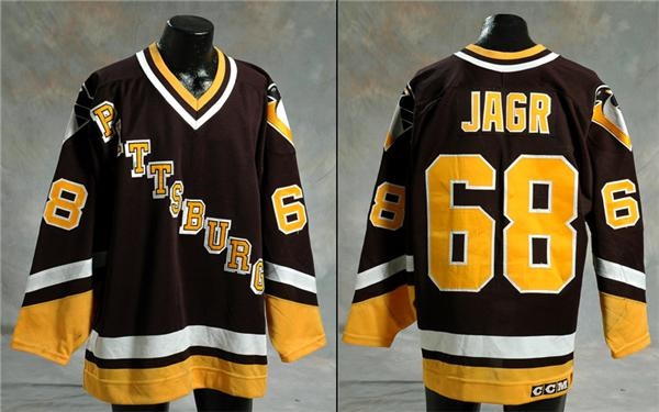 Jagr's Road (black) jersey dates from the Pittsburgh dominated era of the early 90's and owns all the tell-tale signs of sensationally heavy use. Stick marks are numbered in the dozen, board paint transfers, a number of burns on the sleeves, as well as some unrepaired tears on the elbows. Inside the collar is very noticeable pilling and a "Maska" flag tag written with his number "68" in faded black marker. And finally, the fight strap has built up significant salt deposits. Matched with the Lemieux and Stevens jerseys being offered in this auction, one lucky collector might have a chance at reassembling one of the most dominant lines in recent hockey history.