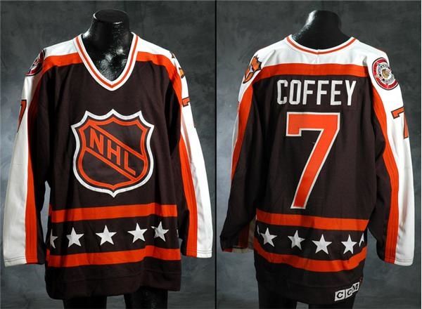 Paul Coffey got the starting nod and suited up in this black beauty for the Wales Conference team during the 42nd Annual NHL All-Star game. Sewn with his name and number "7" on the reverse side, and complete with the "Chicago Stadium - All-Star" patch on the right shoulder, it displays light but noticeable use in the form sweat stains, and some very light stick marks. In the collar is a "Maska Air-Knit" flag tag written with [size] "52" in blue ball point, while on the fight strap down below number "2" has been written in black marker.