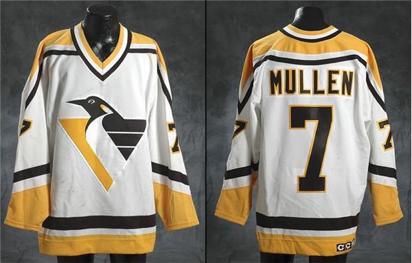 A two-time Lady Byng Trophy winner and three-time Stanley Cup winner (two with the Penguins) before he donned this yellow and white Pens jersey for Pittsburgh’s circa 1994-95, forward Joe Mullen is one of the greatest Americans to ever play in the NHL. Worn by the Hall of Famer near the milestone of becoming the first American to reach the 1,000-point mark in February, 1995. Sweater shows moderate to heavy use, with plenty of stick marks, some red and blue paint transfers and a few major burns on the arms, as well as some pilling inside. Collar has CCM tag with a black sharpie “7”, as well as a size 50 tag.