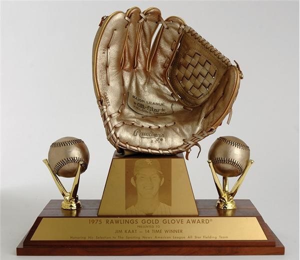 One of the best ever fielding pitchers to step on the mound, Jim Kaat's fourteenth Gold Glove Award from 1975 is offered here. Wood base with a plaque that reads " 1975 Rawlings Gold Glove Award Presented to Jim Kaat - 14 Time Winner, Honoring His Selection to The Sporting News American League All Star Fielding Team". On top of base is a gold-painted Rawlings glove with gold-painted balls held up by baseball bat tripod on both sides. The small rise that the glove sits on also has a plaque on the face of Kaat's face. Kaat currently works as an announcer for the sport and is being considered for possible Hall of Fame induction. EX. Comes with LOA.