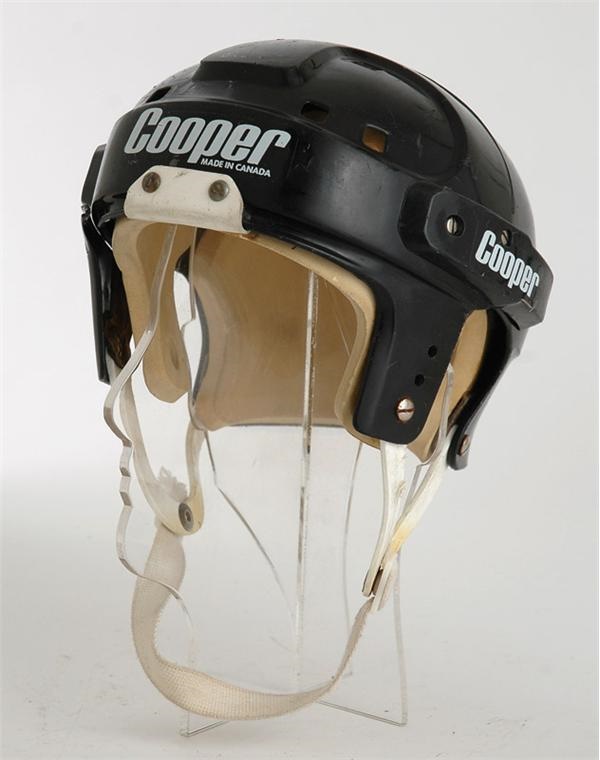 A super helmet from Super Mario! Lemieux gave this black Cooper helmet a good workout during the Penguins’ road games and there’s definitely a season’s worth of use on it. In fact, we believe that it was worn for a few seasons during the 1980’s, and quite possibly his rookie campaign in 1985. Cooper stickers on both sides and the front. The Cooper sticker on the front has been placed over a Cooper logo that was painted over before the sticker, now present, was affixed. This helmet has seen some hard play and the right ear piece has been cracked and repaired and there are significant scratches and scuffs all over the shell. A white “66” sticker graces the back of this phenomenal piece of THE Penguin.