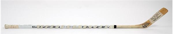 This Canadien stick was used by Samuelsson the game-winning goal of the Pittsburgh Penguins' first Stanley Cup victory. It was an 8-0 romp of the North Stars in Game 6 that sent the Stanley Cup to Pittsburgh for the first time in the team's history. This stick was used for the first goal which "won" the game as the North Stars were shut out. "Samualsson" stamped on the shaft and "5" written on in marker. Original tape on handle, shaft and blade. Noted on the blade is "1st Goal Scored by Penguin In Cup Final." Samuelsson has signed the blade on the tape "And it was the winner! Ulf Samuelsson." Great piece of Penguins history.
