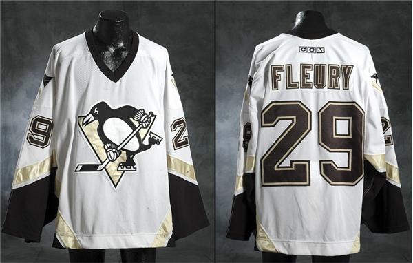 Classic Skating Penguin backed by a gold triangle, this great Pittsburgh sweater shows light, but definite, use, with a spattering of stick and puck marks, from the young and talented goalie, Marc-Andre Fleury, from his first year with the Pens. Tagged on inside of back hem with “Cutting Edge Sports Set # 1 2003-04” patch, and collar-tagged with Canadian flagged manufacturer’s tag with black Sharpie “R 29”, and size 58 tag. Black and silver NHL shield embroidered on back hem, and CCM patch high up on the back collar above Fleury’s black and gold name. Great rookie jersey from one of the game's most exciting young stars!