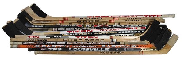 Fine collection of 49 game used sticks from some of hockey's finest players of today and yesteryear. Here is the breakdown: Bobby Clarke, Rod Brind’Amour, Mark Howe, Dennis Hull, Jaromir Jagr, Alexander Mogilny, Bryan Trottier, two from Brian Bellows, two from Ed Olczyk, Keith Tkachuk, Larry Robinson, Bernie Nicholls, two from Adam Oates, Mark Osborne, Doug Gilmour, Mats Sundin, Steve Larmer, Bobby Smith, Alex Delvecchio and team members, Peter Bondra, Borje Salming, Mike Gartner, Bill Barber, Denis Potvin, Clark Gillies, Craig Muni, Wayne Gretzky, John LeClair, Eric Lindros, Denis Savard with Blackhawks teammates, Mats Naslund, Johnny Bucyk, Alexei Yashin, Mario Lemieux, Brian Sutter, Wayne Cashman, Pierre Turgeon, Ray Bourque, Guy LaFleur, Darryl Sutter, Teemu Selanne, Ron Francis, Peter Forsberg, Brett Hull and Steve Yzerman . All show nice game use and are uncracked, save a select few.