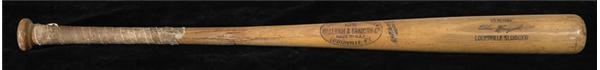 Mr. Met subjected this Louisville Slugger to some serious punishment. A rare “Eddie Kranepool” is crisply stamped on the barrel and “7” is written in faded marker over a “R43” stamp on the knob. Good game use with scratches and red paint scuffs and a crack that runs from the taped handle to the beginning of the barrel. The bat measures 35.5 inches and is 32.4 ounces. A very well used bat from the ever popular Mr. Met.