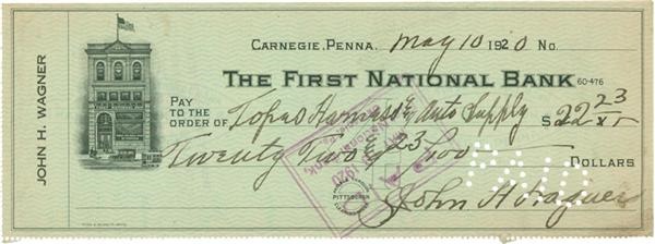 Personal check on "John H. Wagner" account pays $22.23 to "Topas Harness & Auto Supply" and is written completely in his hand in EX-MT black fountain pen ink. The document, dated May 10, 1920, has a single vertical fold and "Paid" perforated stamping that interferes with his less frequently seen "John H. Wagner" signature, which is otherwise very strong (7/10).