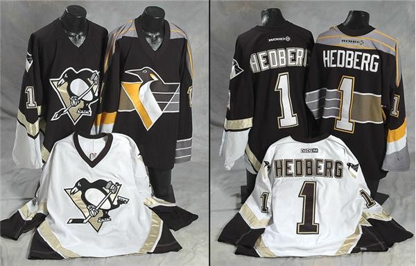 A full line up of jerseys from Johan “Moose” Hedberg. All three, (home, road and alternate) show great game wear. Away jersey in particular has black scuff marks on both shoulders. All three jerseys are goalie models, size 58 and have Hedberg’s number “1” written on the tag in black felt tip. A superb trio.