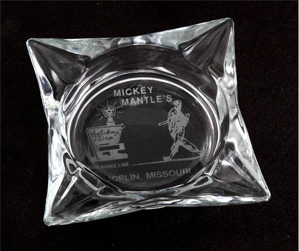 This fantastic, heavyweight, high quality ashtray is an item that combines baseball, Americana, and pop culture! A real find for any Mickey Mantle collector, from the Holiday Inn hotel he owned in partnership with Harold Youngman. With the onset of political correctness, smoking related items, especially those that tie All - American sports heroes like #7, with cigarettes or tobacco use, are never to be found again. This ashtray has very clear graphics at the top in block letters "MICKEY MANTLE'S" and an etching of Mickey at the bat as well as the famed 50's icon "Holiday Inn" billboard, and "JOPLIN, MISSOURI" printed at the bottom. This was not a souvenir, it was used in the hotel's lounge.