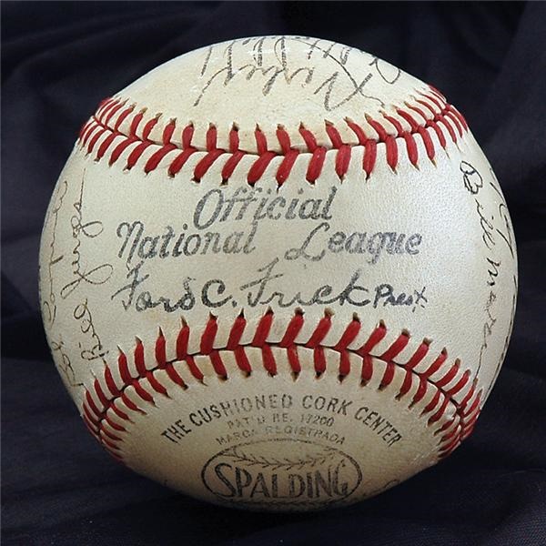 Rare Spalding ONL Frick baseball signed in black fountain pen by 22 members of the 1942 war-years New York Giants. Signatures include a blazing Mel Ott (HOF) on the side panel, Johnny Mize (HOF), Carl Hubbell (HOF), Willard Marshall (sweet spot), Gus Mancuso (sweet spot), Harry Danning, Mickey Witek, Billy Jurges, Babe Barna, Dick Bartell, Buster Maynard, Hank Leiber, Ray Berres, Hal Schumacher, Bob Carpenter, Cliff Melton, Harry Feldman, Bill McGee, Dave Koslo, Tom Sunkel, Hank Leiber, Ace Adams and one other. Ball is cream colored with bold President's/League stamps, signatures grade an overall 8 to 9.