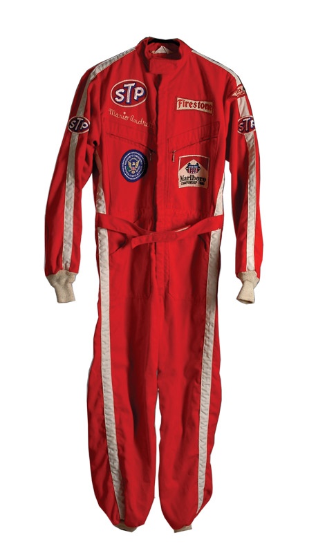 This full-length racing uniform is an electrifying Marlboro red, and once enveloped the man whose name has become synonymous with auto racing in the United States and beyond - Mario Andretti. Worn during his 1970 Indy Car/ USAC campaign, the same year in which the champ won his second 12 hours of Sebring, and a year after his astonishing season in ’69, during which he won the Indianapolis 500. Clearly at the top of his game, this one-piece carries lots of Andretti class, and is in phenomenal shape, with nice use. Patches galore, including “Marlboro” and the “President’s Conference Physical Fitness & Sports” on breast pockets, “Firestone” on upper left chest, “STP” on shoulders, mid-back and on right upper chest above his chain-stitched name, and the garment’s manufacturer logo, “Elin Racing Apparel,” on upper left shoulder. “Elin” tag in collar, and “Firestone” embroidery on white plate on upper back. Ferocious find for any racing fan, and comes directly from Mario with his hand-signed LOA.