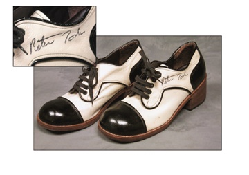 A pair of Davey's show worn Emanuelle of Brazil shoes signed by Mike Nesmith on the right and Peter Tork on the left, unfortunately Mickey and Davey signed them but signed in black on the black toes--what morons!!
