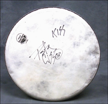 Signed in black by original drummer Peter Criss, this well-worn skin has seen much use by the master beater of the most well-known shock rockers in the world.
