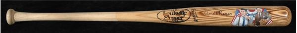 Two great American institutions - Ronald Reagan and the Louisville Slugger - together in this stylish hand painted bat by renowned sports artist, Jolene Jesse. Reagan’s portrait is hand-painted twice on the barrel - with baseball glove as if he’s about to throw out the first pitch, and at the broadcast microphone of WMGM - and signed in black sharpie (9/10). “Jesse” signs with notation “1/1” and date “06”. Reagan originally signed this for an ex-NJ Devils trainer. Glorious item!