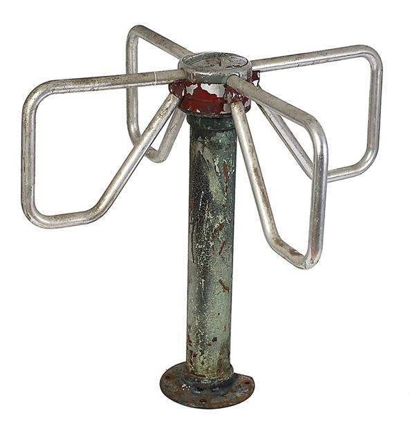 A turnstile from the Boston Braves Field, a rare and most desirable item. Designed and made by Perey of New York, the piece shows years of use from the dates of the old Braves. The usage includes many layers of paint with chipping, a light shade of green is the last noticeable. The arms are metallic with a little overspray from the paint jobs. There is a large 6" chip from the metallic base of the turnstile but it still stands on its own and is surprisingly very stable. Taken directly from the Braves Field, this piece measures 35x39x39".