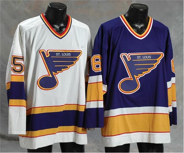 Action-scarred jersey double bill from the St. Louis Blues' 1994 playoff series, both containing "Official St. Louis Blues 1993-94 Season" blue stamps on inside back hem, with corresponding inventory control numbers (with blue-Sharpied added-on numbers) and team holograms affixed as well. Both have their names on nameplates, and tackle-twilled lettering, as well as embroidered "CCM" and "NHL" on tail. Housley's blue wonder has Maska care tag and size 50 flag tag in collar, along with some stick marks and light burns on sleeves. Janney's white garment has terrific yellowing on nameplate, and an inside collar adorned with CCM care tag and size 52 flag, and attacked with black stick marks on front, back and sleeves. Both beauties have St. Louis Blues LOA's from BlueNote Authentics.