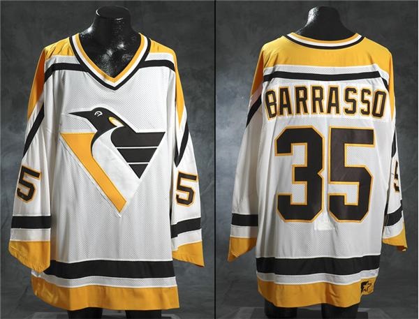 White-breasted Penguin sweater carries a lot of use, with stick marks and some red paint transfers on the arms from the goal posts. Extraordinary goalie Tom Barrasso draped this jersey during second half of the regular 98-99 season, the Stanley Cup playoffs and 1999-2000 preseason, only to be traded to Ottawa after twelve seasons of devotion to the Pens. Barrasso delivered for Pittsburgh, especially with masterful defense at the net during their consecutive 1991 and 1992 Stanley Cup titles. This garment was his swansong as a Penguin. Collar hides Starter manufacturer’s tag with black sharpie “35”, as well as size “60-G” tag below that. Excellent wear throughout including numerous puck and stick marks along with excellent pilling at the collar and cuffs. Fight strap has been cut-out which is customary on Barrasso’s game worn jerseys. Comes with an LOA from the Pittsburgh Penguins and is registered into the MeiGray System.