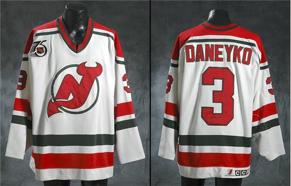 They just don't make 'em like this anymore, both in terms of Ken Daneyko and this hammered New Jersey Devils offering. This Ken Daneyko jersey truly captures the player's patented determination. Proudly displaying the NHL 75th Anniversary patch on the right chest and the New Jersey Devils 10th Anniversary patch on the back hem, this jersey is HAMMERED with use. Over 20 repairs in all scattered on both sleeves and the back hem to go along with the heavy pilling inside on both sides of the crest, the back hem where the fight strap hangs and more heavy pilling inside both elbows. Also of note are the solid stick marks, board burns, paint transfers and un-repaired holes that are strewn across the jersey. Finally, the front ribbed collar seam has been torn from fight abuse. Comes with a New Jersey Devils Letter of Authenticity signed by President and General Manager, Lou Lamoriello.
