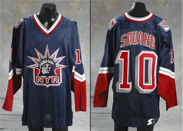 This Lady Liberty New York Rangers jersey was game-worn by forward Marc Savard during his inaugural 1997-98 NHL season, the same year he was named to his other league’s - the AHL - All-Rookie team. Triple-layered tackle-twilled lettering and numbers, with Ranger shield patches on shoulders. Blue jersey has 1997-98 year tag, with black Sharpied “MGS # 101317”, on back inside bottom hem. Starter manufacturer’s tag and size 52-R tag in collar. Light to moderate use, with stick marks and burns. Comes with an LOA from the New York Rangers signed by President and General Manager, Neil Smith and is registered into the MeiGray System.