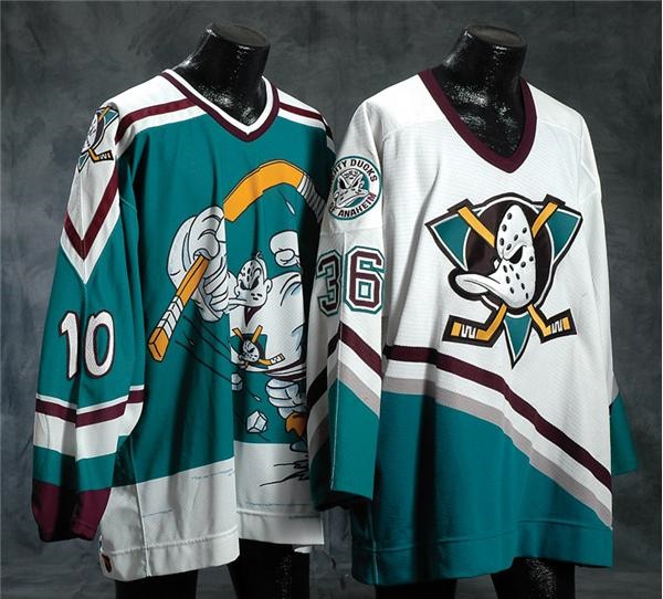 Lot # 627: 1995-96 Oleg Tverdovsky & 1996-97 J.J. Daigneault Anaheim Mighty Ducks Game Worn Jerseys