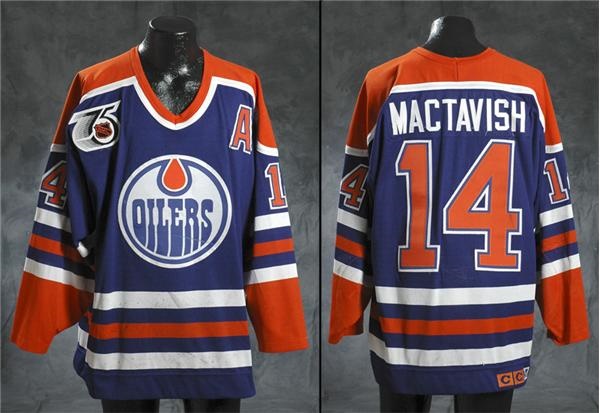 Battle-scarred remnant from center Craig MacTavish, with many games worth of use, including 4 team repairs, lots of stick marks, a hole on the sleeve, and a shallow incision across the Edmonton Oiler emblem on chest. Distinctive jersey in that his Alternate Captain's “A”, found here on the left chest, would soon be graduated to Captain within a year’s time. Road (blue) jersey has "91-92 1" written with marker on inside of collar, where it shares space with size 52 and Maska flag tags. NHL 75th anniversary patch on right chest. All lettering and numbering is triple-layered tackle twill, except for the individually sewn lettering in “MacTavish” on nameplate on upper back. Comes with an Edmonton Oilers LOA signed by Peter Pocklington.