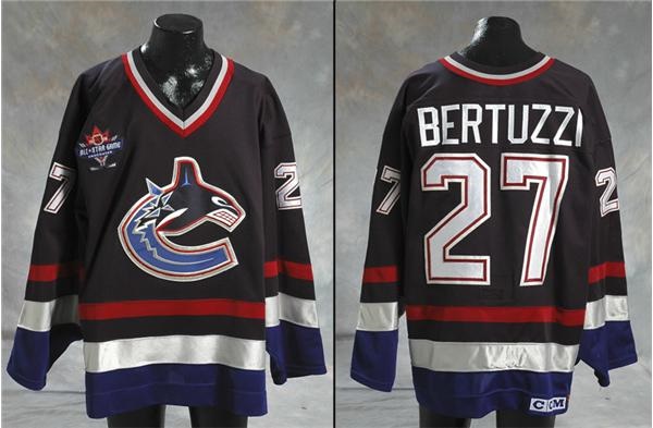 The robust left winger Todd Bertuzzi came into his own with the Vancouver Canucks, compiling five towering 50+ point seasons (97 pts. in 2002-03!) in the new century, a far cry from his inconsistent play at the end with his first NHL home team, the New York Islanders, and during his first year with the Canucks, 97-98, where he wore this Road (dark navy blue), gnashing orca jersey, seeing some nice use, showing some burns on the arms. 1998 All Star Game patch on right breast, tackle-twilled numbering, “Bertuzzi” nameplate on verso, "S-2" written in marker on fight strap, and CCM “Goalie style” flagger in collar. Conclusively photo-matched to a shot of Bertuzzi wearing this exact jersey. Vancouver Canucks LOA on team letterhead included.
