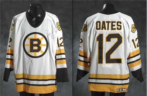 Fresh from his masterful 1990-91 season, where he was of pivotal assistance to friend Brett Hull, Adam Oates said goodbye to his three years with the St. Louis Blues when he was traded mid 91-92 season to the Boston Bruins. He would later peak in Boston, but first would show his worth as an integral part of the Northeast Division title the Bruins clenched at the end of his first season with them. This bear of a Home (white) jersey is signed by the versatile forward on its left breast, in an 8/10 black Sharpie. Garment has “2nd Set 1991-92 Season” stamp on inside of back hem, where Oates has black-sharpied, “My game jersey 91/92,” and initialed, “A.O.” Fight strap cut out. Fine use with stick marks, a rip, burns, and pilling inside. The NHL 75th anniversary patch has been removed. Maska and size 50 flags in collar.