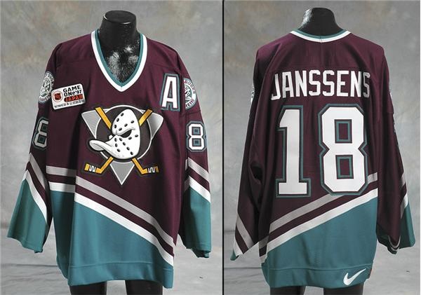 An aggressive center, Mark Janssens helped his Mighty Ducks to the second round of the Western Conference playoffs in the 1996 - 97 season, though the Anaheim team couldn’t repeat that distance in this jersey’s season of play, 1997-98. Still, this fierce-billed garment has definite, though light, use, with some stick marks, and a hole and burn on its sleeve. “Game ONe '97, Tokyo, Japan, October 3-4, 1997” stamp on inside of back hem. “Game One '97 Japan” patch on right breast, and Alternate Captain's “A” on left. Collar bears Nike size 56G banner tag, size 56 flag, “Center Ice NHL” banner tag, and “Made in Canada” flag slightly sewn at bottom. Includes team LOA.