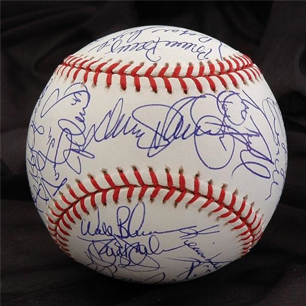 Rawlings Official 1986 World Series (Ueberroth) baseball signed in blue ballpoint by 32 members of the 1986 World Champion New York Mets. Signatures include manager Davey Johnson on the sweet spot, HOFer Gary Carter, Keith Hernandez, Mel Stottlemyre (coach), Rafael Santana, Bobby Ojeda, Ray Knight, Darryl Strawberry, George Foster, Howard Johnson and many more. Ball is MINT with signatures that grade from 9 to 10. Accompanied by two LOA's.