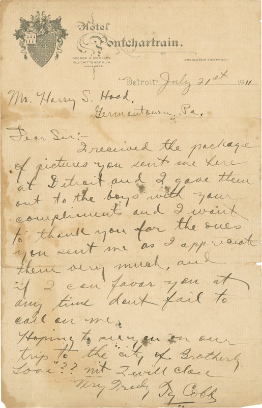 This letter written by Ty Cobb, on Hotel Pontchartrain stationary, is addressed to Mr. Harry Hood. In it Cobb thanks the him for the pictures and indicates that he gave them to the "the boys", presumably his fellow Detroit Tigers. This piece shows a different, more polite, side of Cobb than the one on display on the diamond, where his will to win and competetive fire made him one of the most feared players in his era. The stationary has a tear at the upper mailing fold that has been repaired and some foxing around the edges, the writing and signature grade a remarkable 8/10. The letter comes with a LOA.