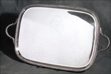 It's reason to boast when you take the American League pennant from the chronic Champion Yankees, and this elegant sterling serving tray surely once held its share of celebratory highballs. Striking engraved image of owner Walter Briggs at center, with engraved facsimile signatures of such stars as Gehringer, Greenberg and Schoolboy Rowe surrounding. Presented by "The Baseball Citizens of Detroit." EX-MT condition. Weighs a ton and all in silver. Presented only to players and VIP's.