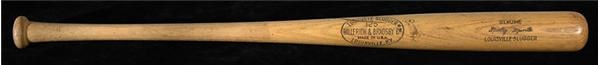 In the hands of a legend, a bat became a symbol of the game itself in all its facets and no legend knew the game as well as Mickey Mantle. Nicknamed "The Mick" or "The Commerce Comet" by many New York sportswriters, Mantle was an American institution whose talent would abet towards twelve pennants and seven World Series titles for the New York Yankees from 1951-1968, punctuating the team's legendary status. This game-used bat was gripped tightly by the legend in his later years (65-68) and was an instrumental part of his .295 average. A half a decade after he battled the brooding Roger Maris for Babe Ruth's home run record, Mantle's bat shows the battle scars of a well-honed instrument, slightly cracked with slight remnants of pine tar. Well-used Louisville Slugger: 36 inches and 32 ounces.