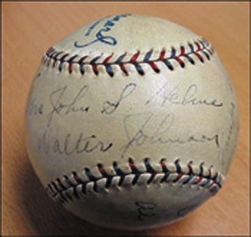 Historic sphere is marked by the Big Train, "Tampa, Florida, March 1, 1929," placing it at the very beginning of his tenure as manager of the Washington Senators. OAL (Barnard) ball has sweet spot inscription reads, "To Mrs. John S. Helms, Walter Johnson" in 8/10 black ink. Side panel inscription in another hand will not be visible when displayed. A very strong example of this rare single, made even more desirable by its impressive vintage.