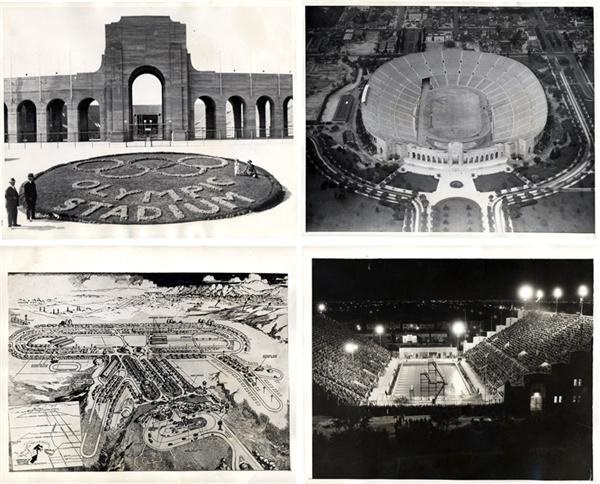 A small but glorious set of eleven shots of Olympic structures and arenas from the 1932 Summer Olympics in Los Angeles. All the 8x10's featured here are in pristine black-and-white. The set features photos of Olympic pavilion, homes being constructed and an interesting aerial illustration of the entire Olympic Village with LA pictured in the background. In EX condition.