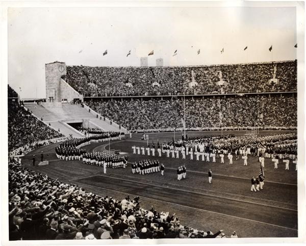Spectacular images of the 1936 Summer Olympics in Berlin, Germany are as good as if Leni Riefenstahl took them herself. These twenty-seven photos capture the athletes as they train, compete and enjoy small leisure moments in wonderful black-and-white. The collection includes several different sized photos though most are 8x10's. A wonderful depiction of American spirit, one photo pictures a German sailor giving a US discus thrower a memento from her travels. A great collection overall.