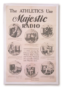 Impressive advertising piece measures 25x35". Features, "The Athletics Use Majestic Radios." Pictured are Jimmie Foxx, Al Simmons, Lefty Grove, Eddie Collins, Max Bishop, Mickey Cochrane, George Earnshaw and Jimmy Dykes. Shows them inside baseballs with laces listening to these radios with them all making their pitches. Like Lefty Grove, "Next to a World Series ticket - A Majestic Radio is the next best." Right on the tail of the 1929 World Series, it also lists endorsements from Chicago Cubs Hack Wilson, Kiki Cuyler and Gabby Hartnett. Professionally mounted on linen. Light folds o/w EX-MT.