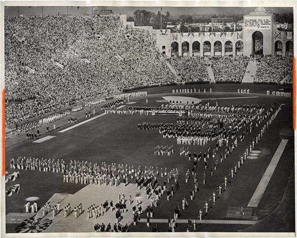 The bucolic splendor of the opening ceremonies of the 1932 Summer Olympics held at the Los Angeles Memorial Coliseum is captured in these four precisely shot photographs. In peerless black-and-white, these 8x10" shots are in EX condition and take in all the excitement of that initial day. Includes a picture of Vice President Curtis being introduced to open the games.